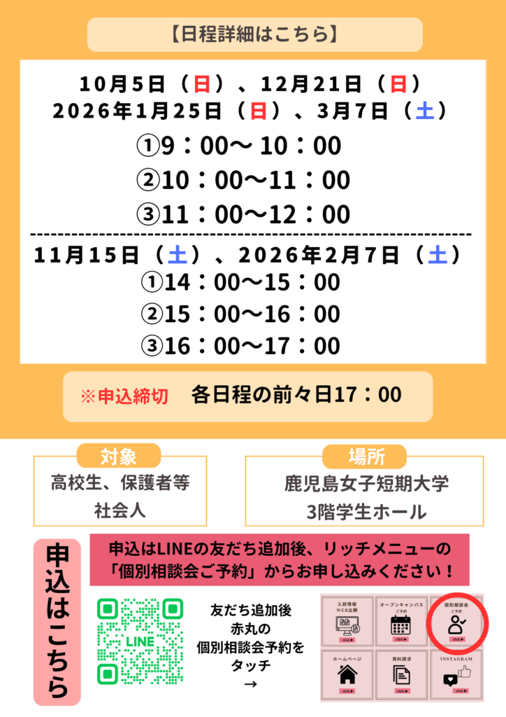 鹿児島女子短期大学では、高校生・保護者・社会人の方を対象に、個別相談会を開催しています。気になる学科のこと、入試や学費、キャンパスライフなど、どんなことでもお気軽にご相談ください。教職員がご説明します。