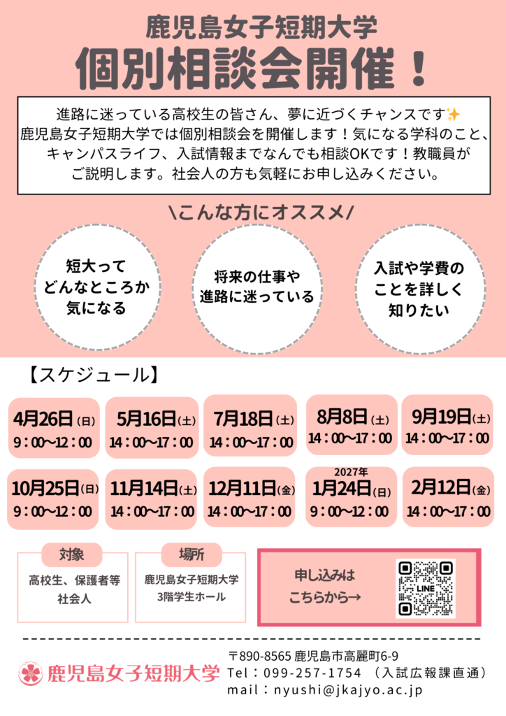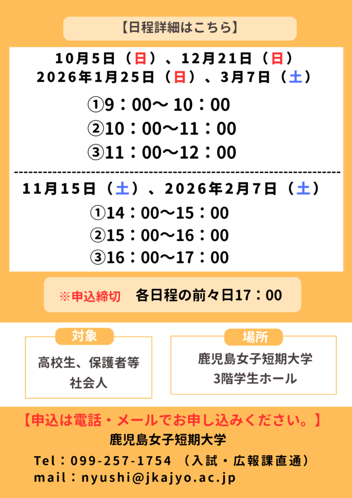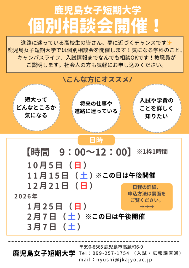 鹿児島女子短期大学では、高校生・保護者・社会人の方を対象に、個別相談会を開催しています。気になる学科のこと、入試や学費、キャンパスライフなど、どんなことでもお気軽にご相談ください。教職員がご説明します。
