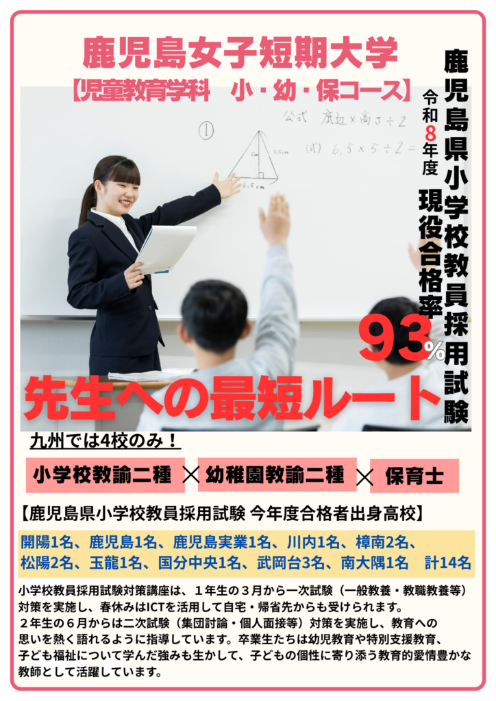 令和8年度鹿児島県公立学校教員等採用選考試験(小学校教諭)にて本学児童教育学科小・幼・保コースの学生が14名現役合格しました!