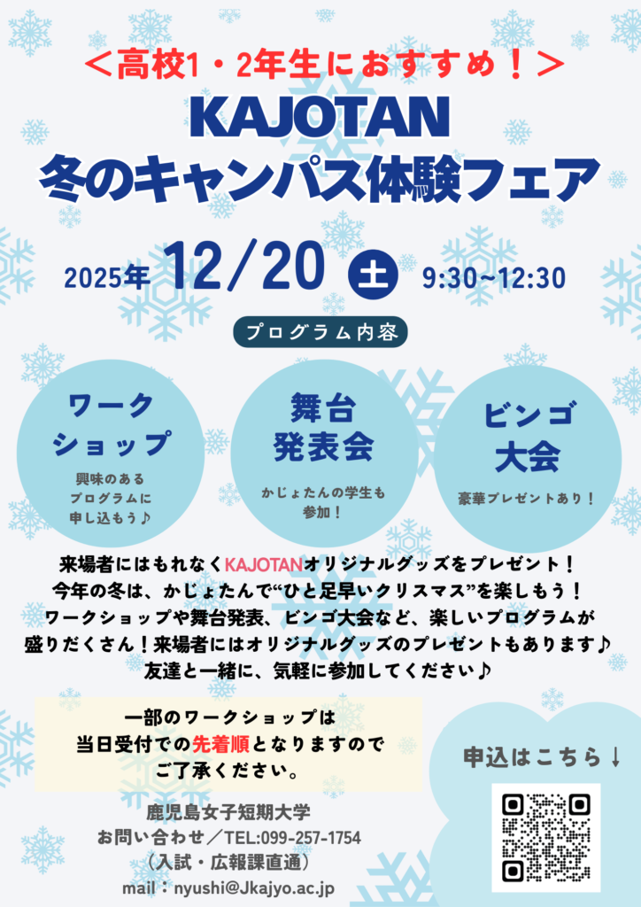 2025.10.21 高校1・2年生におすすめ!KAJOTAN冬のキャンパス体験フェア お知らせイベント 鹿児島女子短期大学のオープンキャンパスを実施します! 開催日は12月20日(土)です! 当日は、ワークショップ、豪華景品ビンゴ大会など、鹿女短の魅力をたっぷりお伝えするプログラムをご用意しています。 お友達やご家族と一緒に参加も大歓迎です!皆さまとお会いできるのを、教職員・学生一同楽しみにお待ちしております! 申込は下のリンクかチラシのQRコードからお願いいたします。 申込はこちら