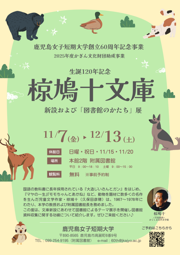 このたび、鹿児島女子短期大学創立60周年記念事業・椋鳩十生誕120年記念事業として「椋鳩十文庫」を新設いたしました。