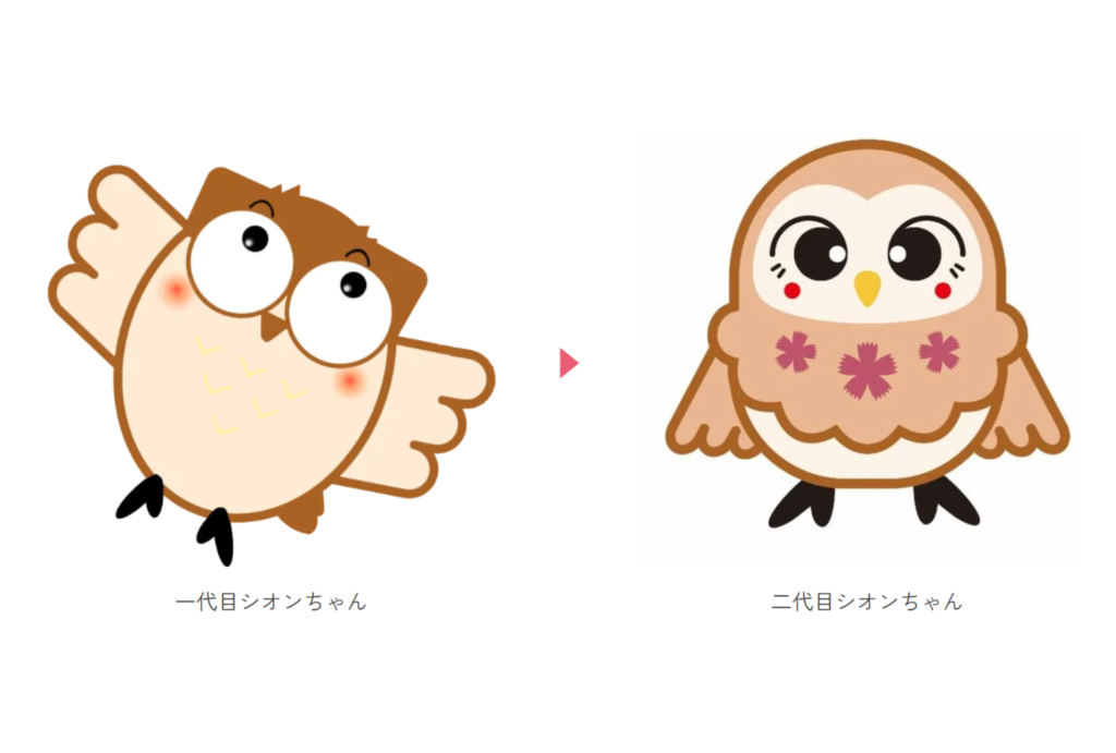 二代目シオンちゃんは、学生から募集したデザインをもとに誕生しました。一代目と同じ、「知性」と「学問」のシンボル幸福を呼ぶ鳥「フクロウ」で、胸元の撫子(なでしこ)と、優しさと強さを兼ね備えた瞳に本学の魅力が凝縮されています。