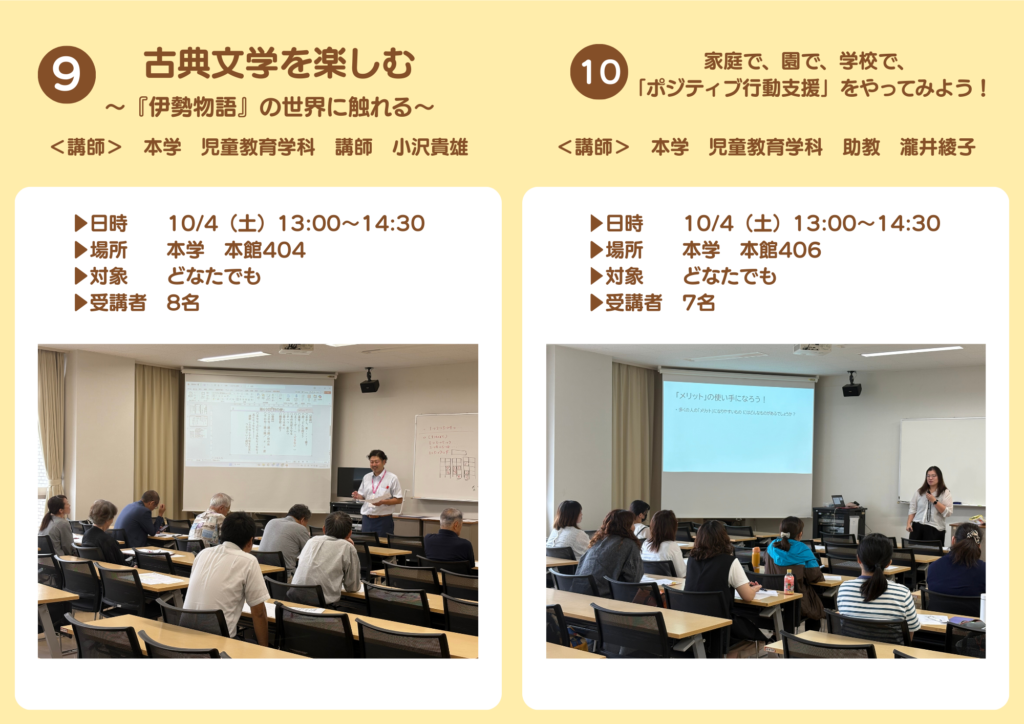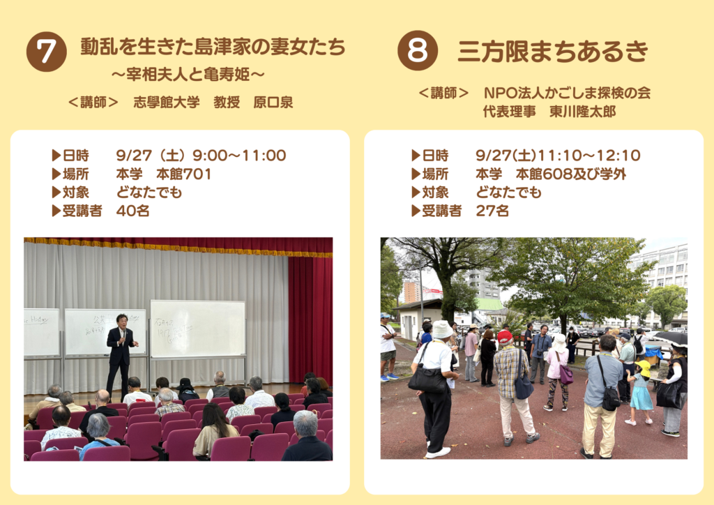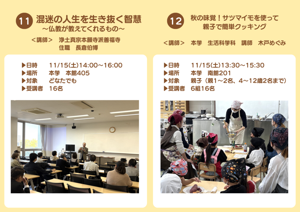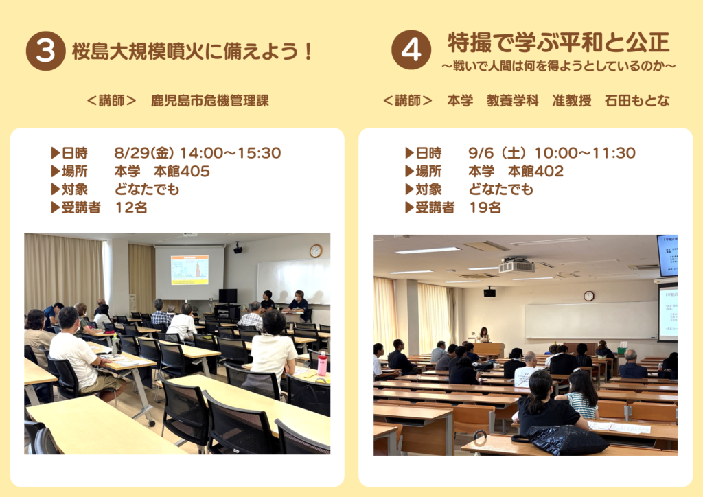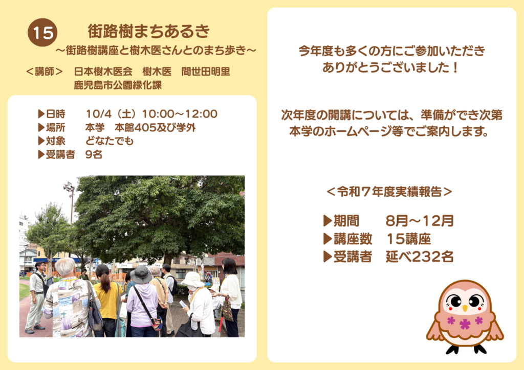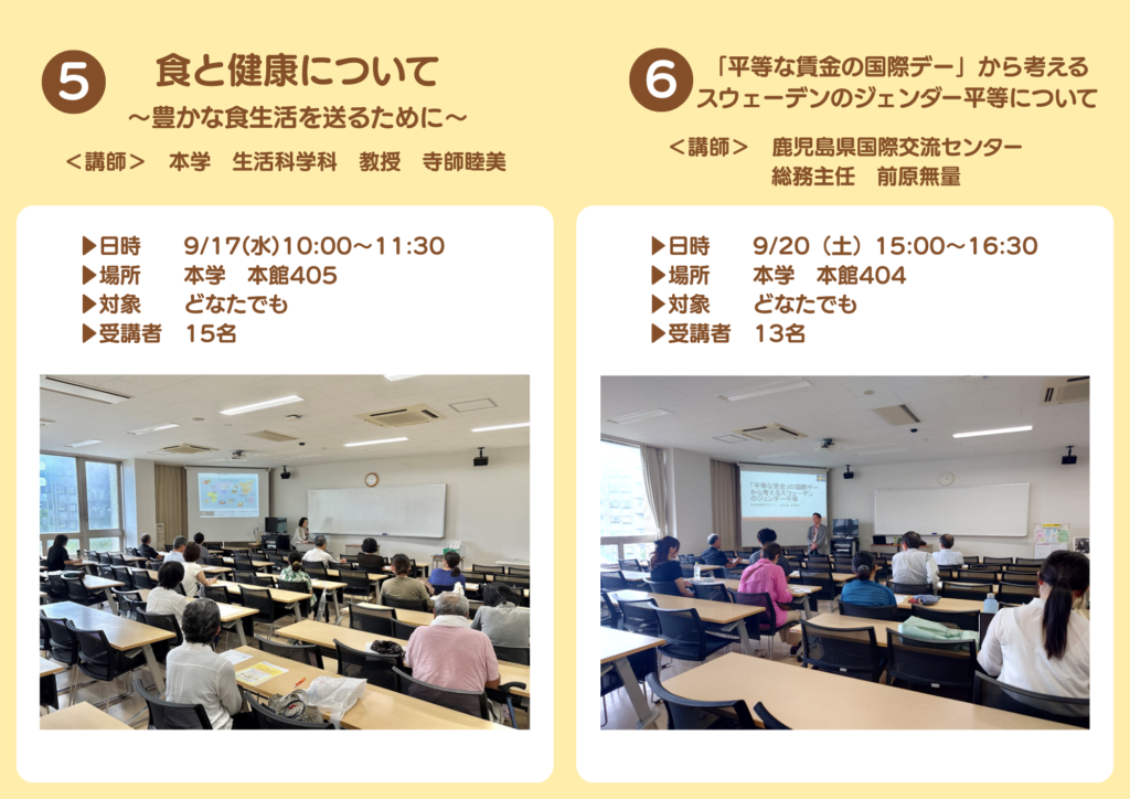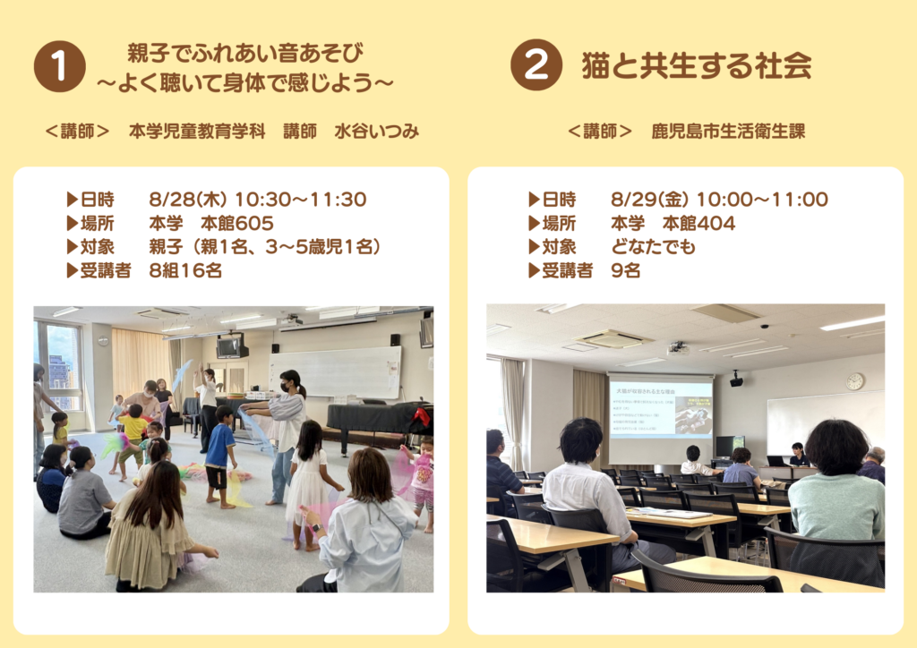 2026.03.02 令和7年度 公開講座(実施報告) お知らせ連携活動 令和7年度鹿児島女子短期大学公開講座は、全て終了いたしました。全15講座を開講し、受講者の延べ人数は232名でした。たくさんのご参加ありがとうございました! 次年度の公開講座につきましては、準備ができ次第お知らせいたします。