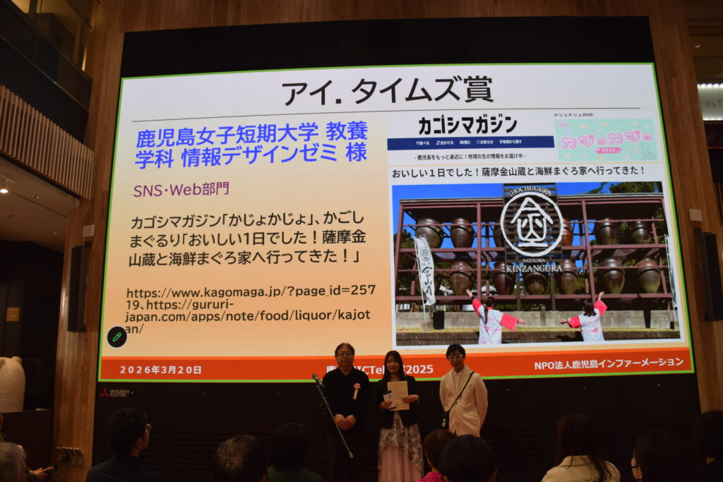 ITCを活用して鹿児島の地域活性化、 地域課題の解決を目指すアイデアやアプリ等にスポットを当てるコンテスト「ICTel大賞」にて、教養学科の情報デザインゼミが協賛企業賞「アイ.タイムズ賞」をいただきました!